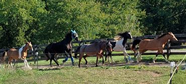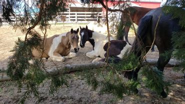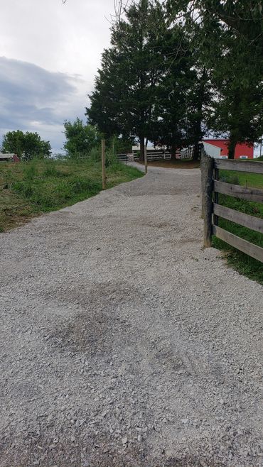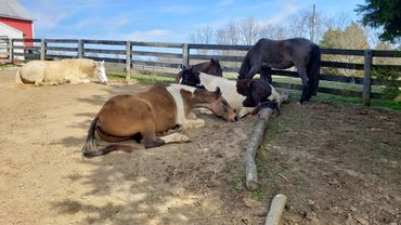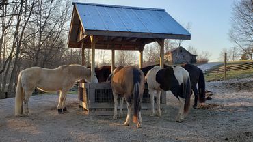 Our main surfaced track paddock was built in 2018. We have pea gravel loafing areas, multiple stonedust paddocks and sand rolling pits. The gravel track is fully surfaced with various substrates, and thus is entirely mud-free. The surfaced track is located on a hillside, which adds to the horses' self exercise. We also have a larger summer dirt track for horses who tolerate limited grazing in dry weather.