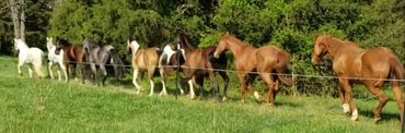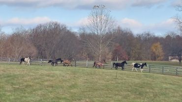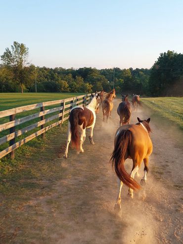 Horses can benefit from the best of both worlds when living on a track paddock. It is essentially a huge long dry lot loop that allows the horses to live in herds and get plenty of exercise and mental stimulation, without over consumption of grass or wearing muzzles. Our horses thrive on the controlled diet of a dry lot, but with the lifestyle of a pasture, typically covering several miles a day.